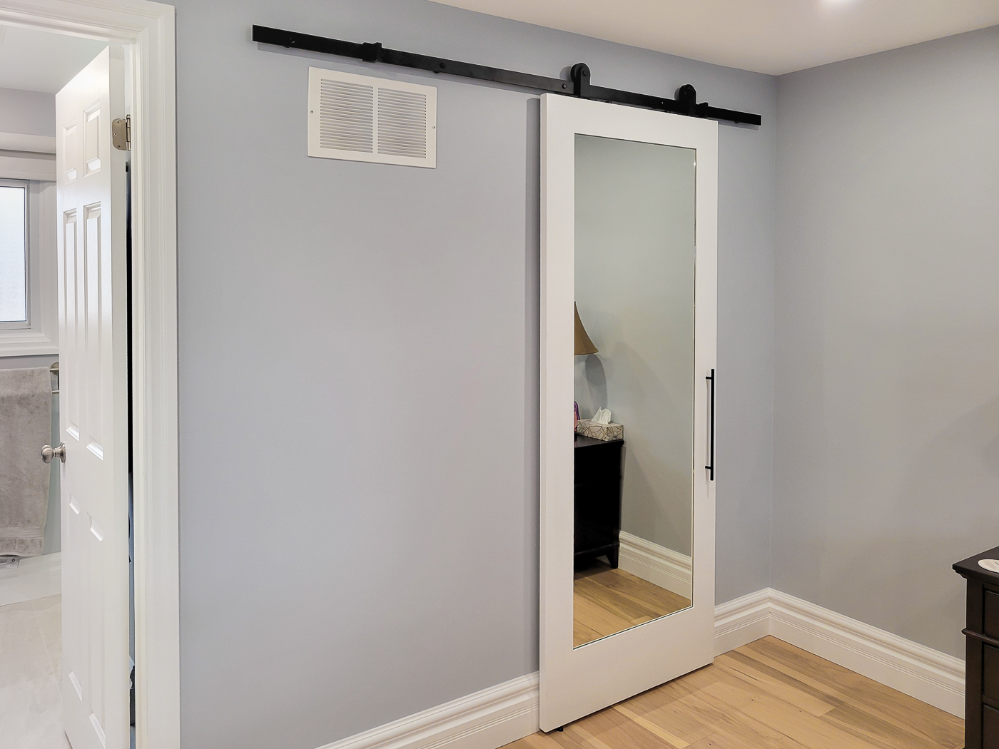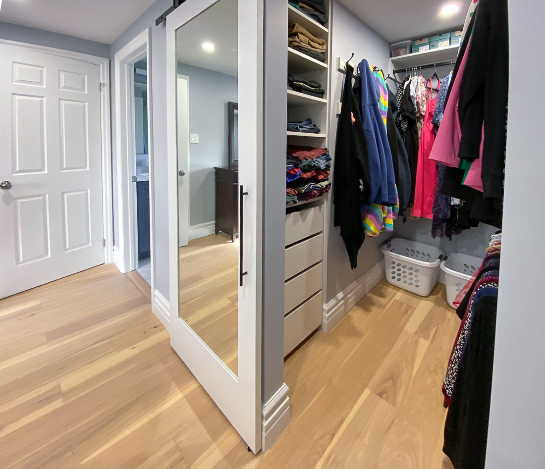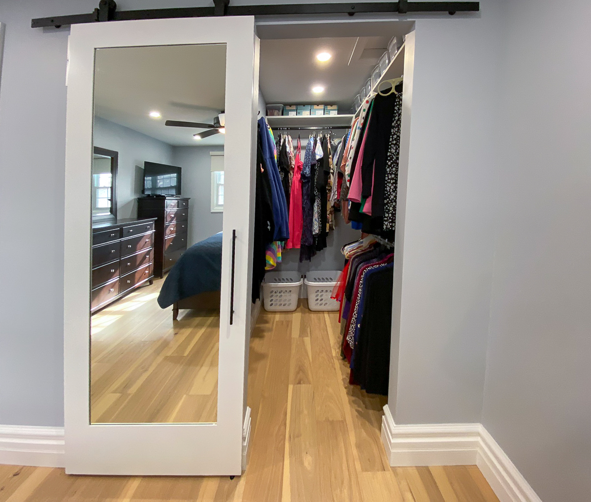 This Master Bedroom has had a closet updo! Although the closet structure was not increased in size during the renovation, alterations between the adjoining Master Bath and the closet were made to improve on the efficiency and utilization of the closet. Melamine drawers were added, along with additional shelving and hanging rods to create a more organized and easily accessible clothing storage. Space was left for hanging longer-length garments and for laundry hampers. A mirrored barn door saves space, is practical and looks great!
