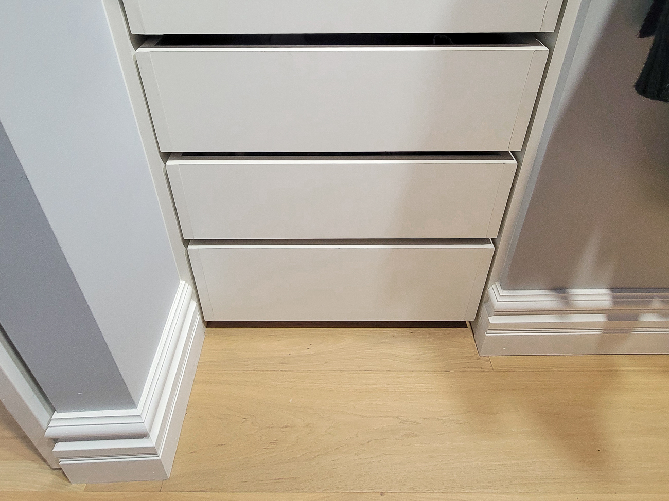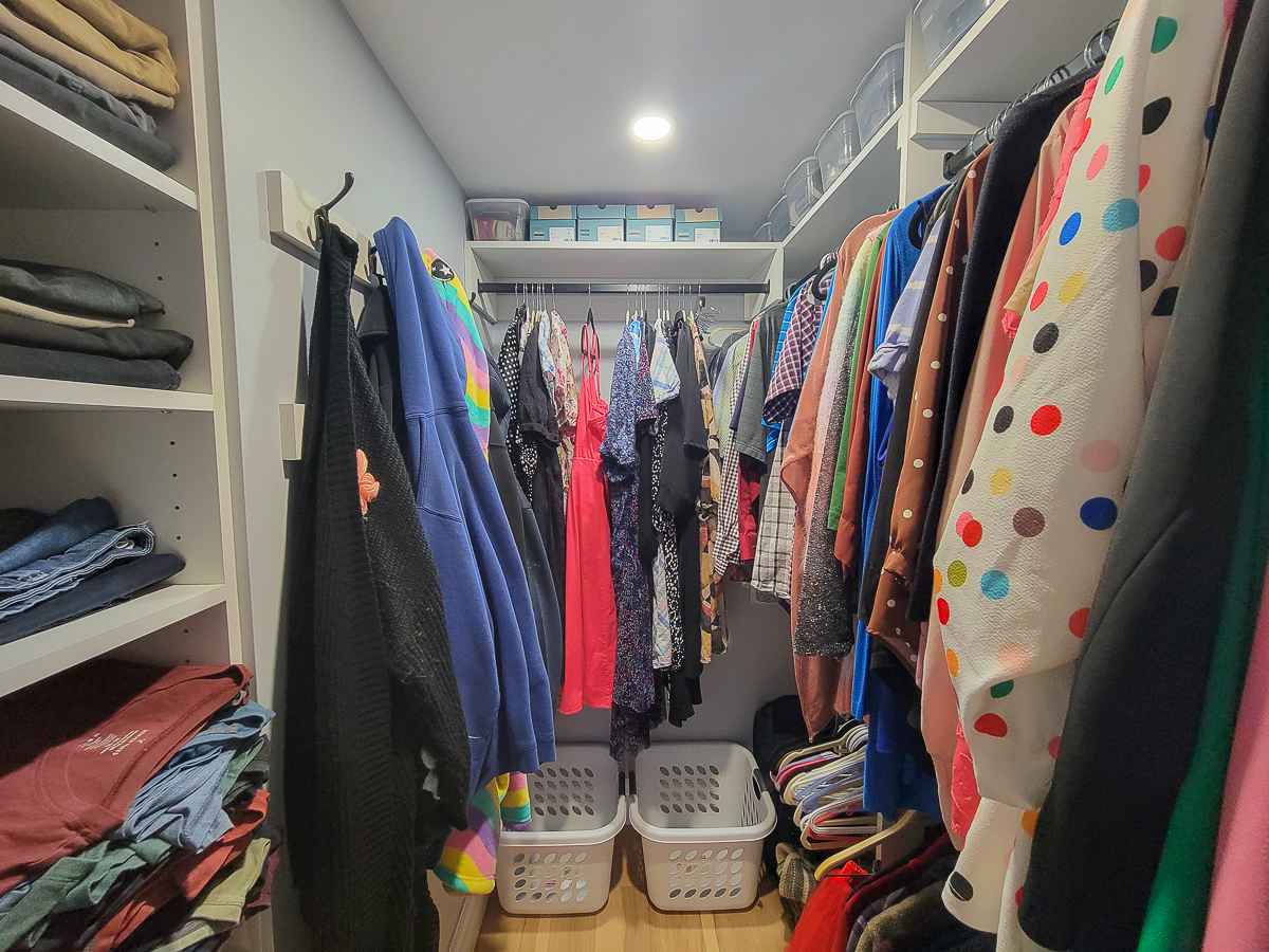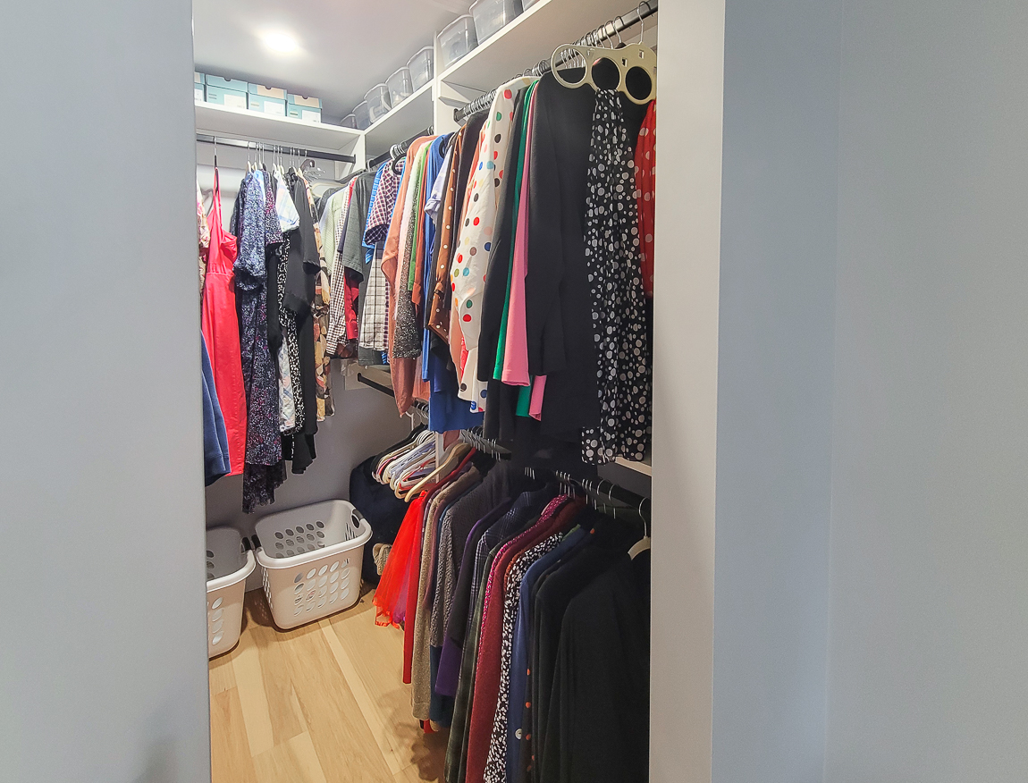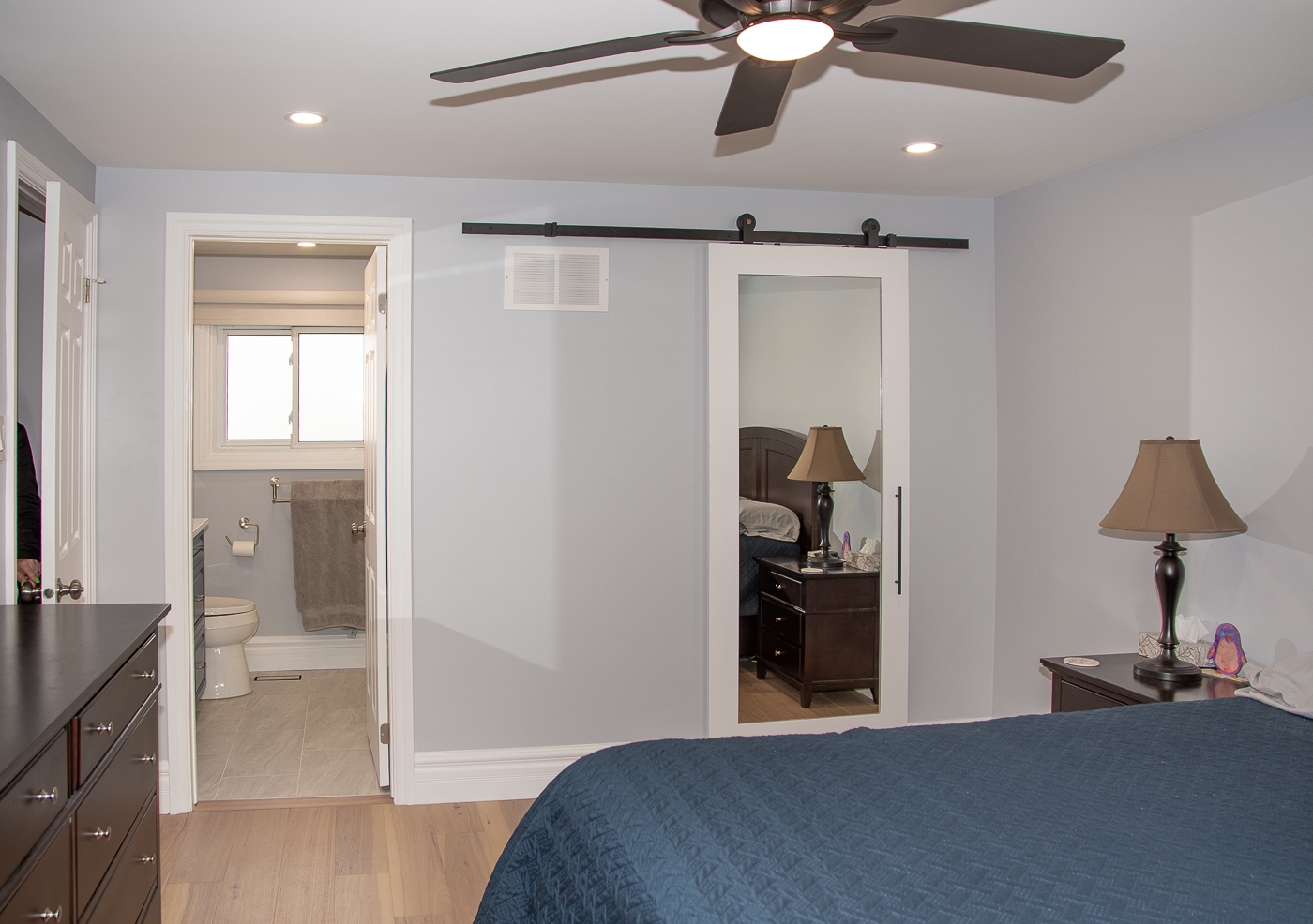 This Master Bedroom has had a closet updo! Although the closet structure was not increased in size during the renovation, alterations between the adjoining Master Bath and the closet were made to improve on the efficiency and utilization of the closet. Melamine drawers were added, along with additional shelving and hanging rods to create a more organized and easily accessible clothing storage. Space was left for hanging longer-length garments and for laundry hampers. A mirrored barn door saves space, is practical and looks great!