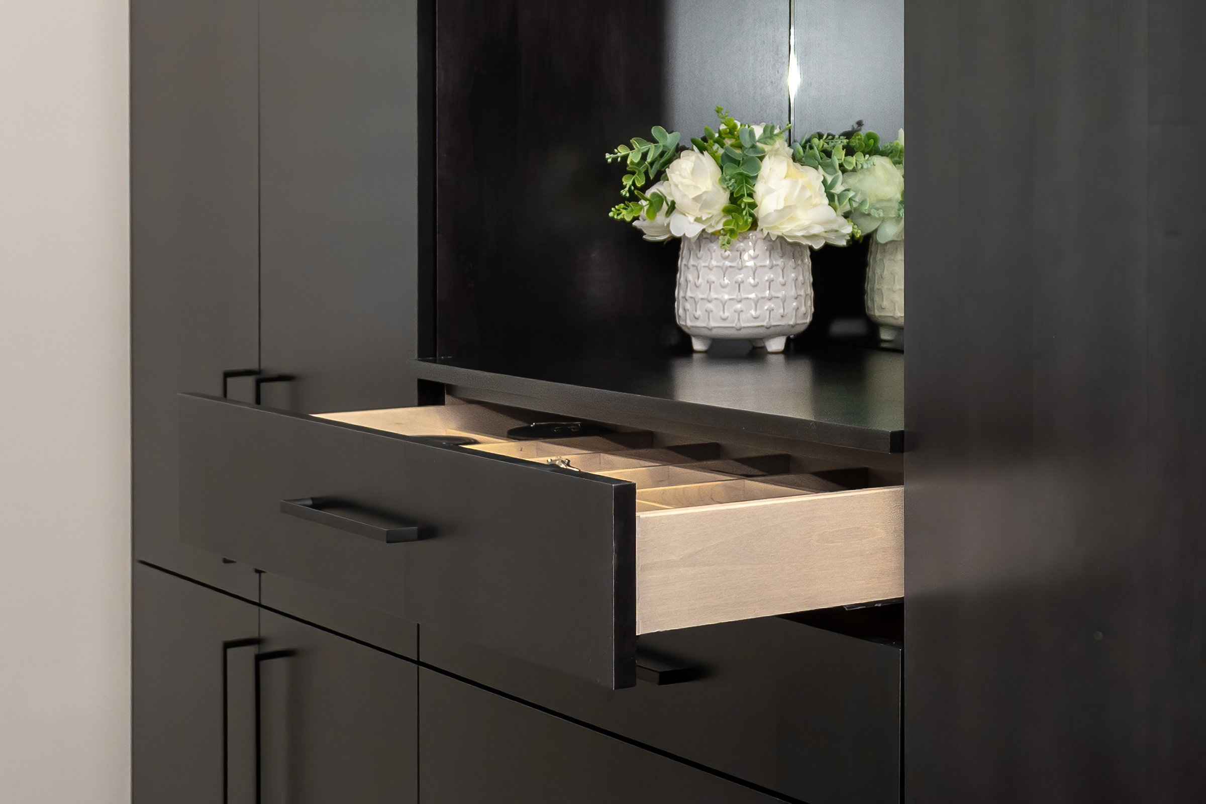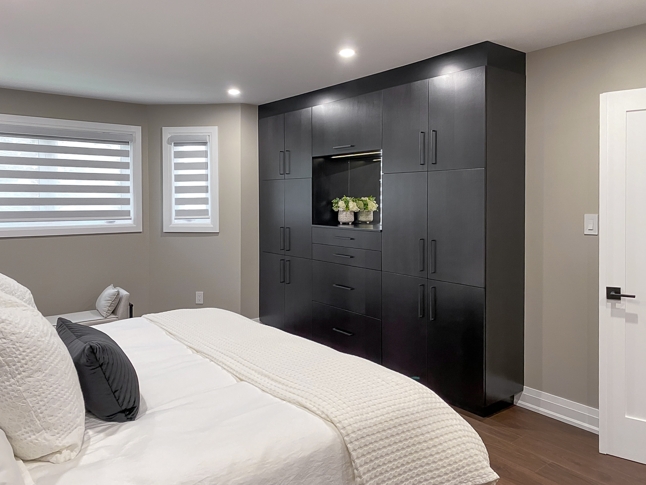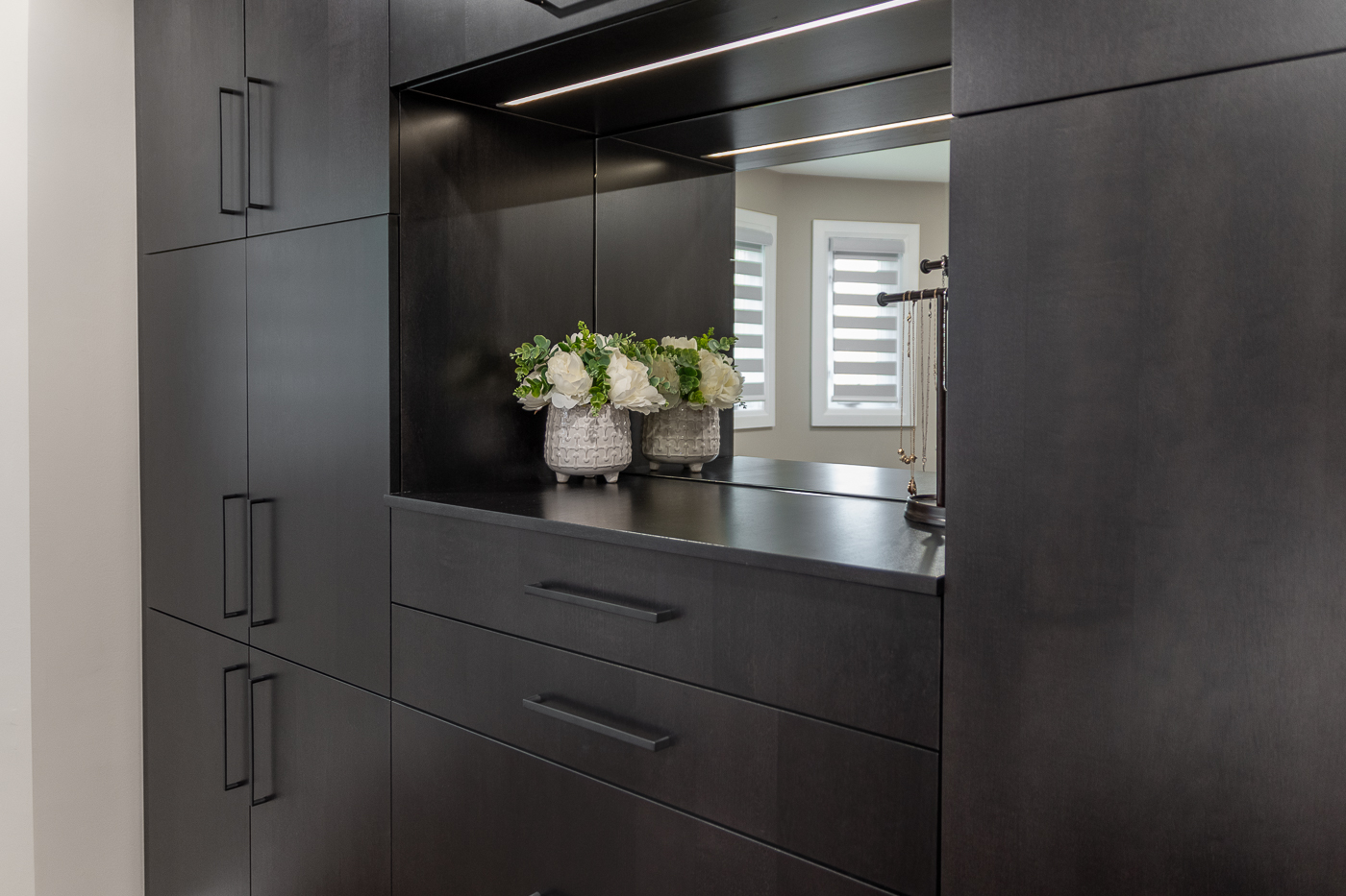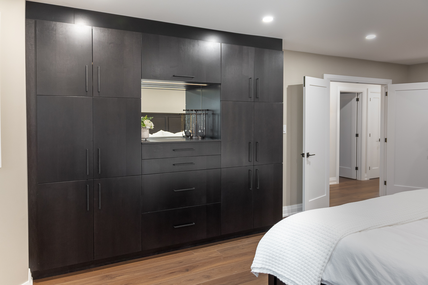 Through design discussion with the homeowners, a floor-to-ceiling freestanding closet was the perfect addition to the room. The cabinetry is in veneered maple, Caviar finish, the doors and drawer fronts in a slab-door style. The interiors are simulated natural birch melamine, and drawers have dovetail construction. This custom-built closet features a recessed mirror with LED strip light above, as well as a drawer with multiple compartments, specifically sized and placed as requested by the homeowner.