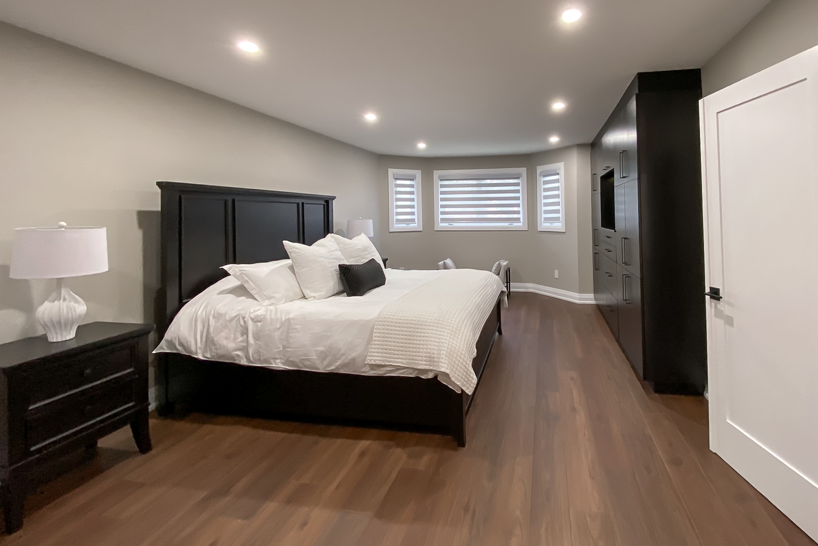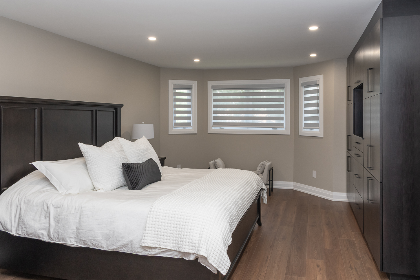This master bedroom has had a major makeover, with upgraded lighting, modern design and improved functionality.