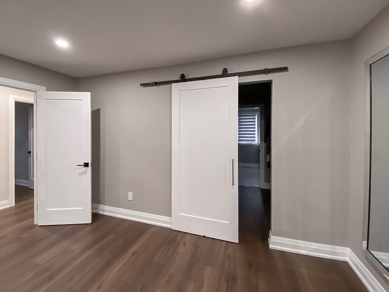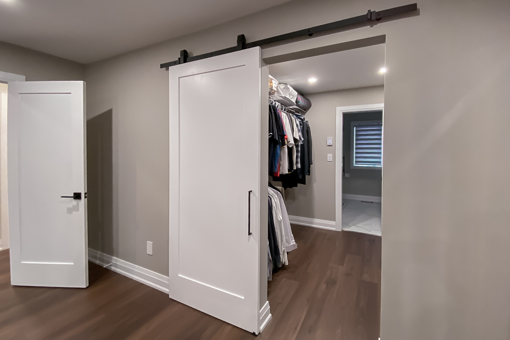 A closet wall in the bedroom was removed to accommodate a new shower in the master bathroom, resulting in a large walk-though closet between the bedroom and master bath. A new barn door on a matte-black running track closes off the closet and bedroom.